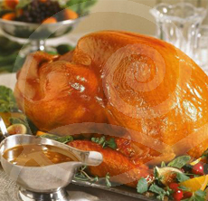 - To prepare turkey, remove giblets and neck from turkey, rinse inside and out and pat dry. Place a cut lemon and a cut-up onion into the cavity and truss the turkey. Place in an open roasting pan breast side up. Brush skin all over with glaze. Bake turkey in preheated oven. Keep glaze warm on stove and continue basting with glaze every 20 minutes.