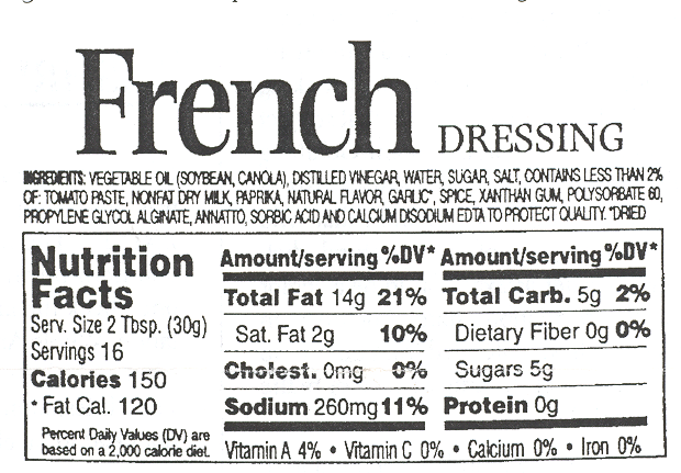 The two per cent rule plays a role in the following: all ingredients must be labeled in order of predominance, by weight. The heaviest is first, and so on. All ingredients that are less than two percent of the weight of the product are freed from being placed in a specific order – that is, order of predominance by weight. As long as the ingredients label writes: “the following ingredients are present at less than 2%” or “1.5%” or so on, the ingredients can be in any order that the manufacturer chooses.7 (Please refer to the ingredient statement on the “French Dressing”).