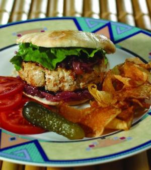 Lean, delicious turkey burgers, served with a tart-sweet red onion confit on pita bread. The confit can be prepared ahead of time. It keeps for up to six